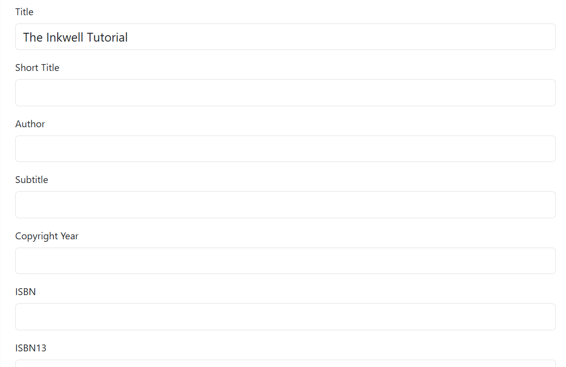 Inkwell allows you to customize your title page, including fields for title, author, subtitle, copyright year, ISBN, and more. The exact fields that are available will depend on the selected template.