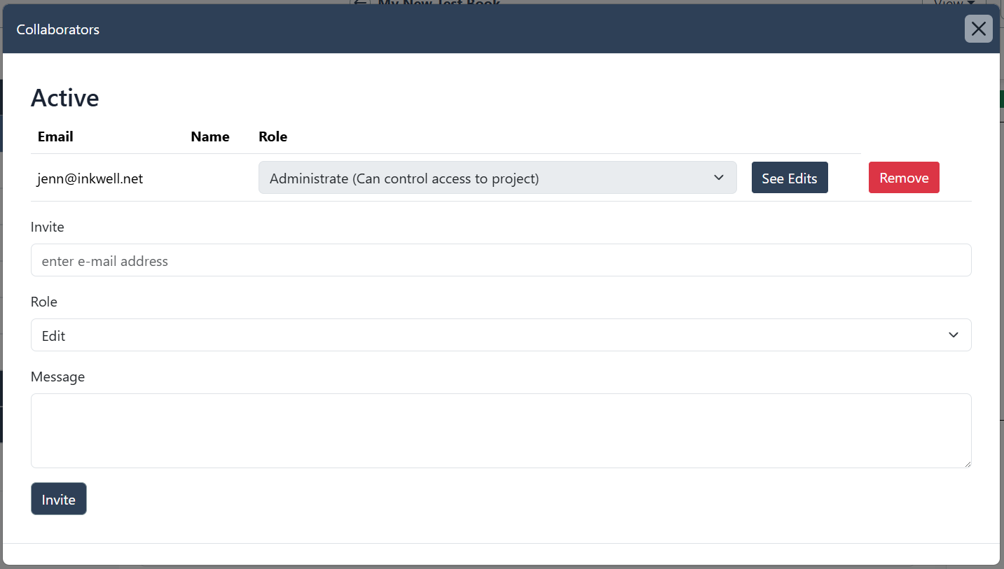 Clicking on this menu option will open a Collaborators screen that displays the current active collaborators and their assigned role. There are four types of collaborators within Inkwell and each type offers a different level of access to the project. The types include Administrate, Edit, Read, and Frozen. Note that the Administrator of the project is the only role that can invite another collaborator to join the project.