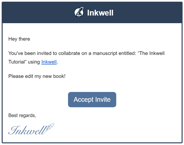 The new collaborator must click on the Accept Invite button within the email that they receive. Once the invitation is accepted, the collaborator will see the project in their list of projects in Inkwell.
