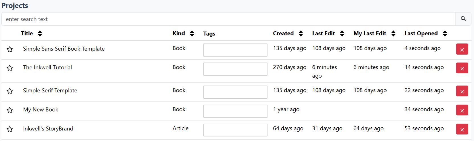 Note that you can sort your projects by a variety of criteria, including: