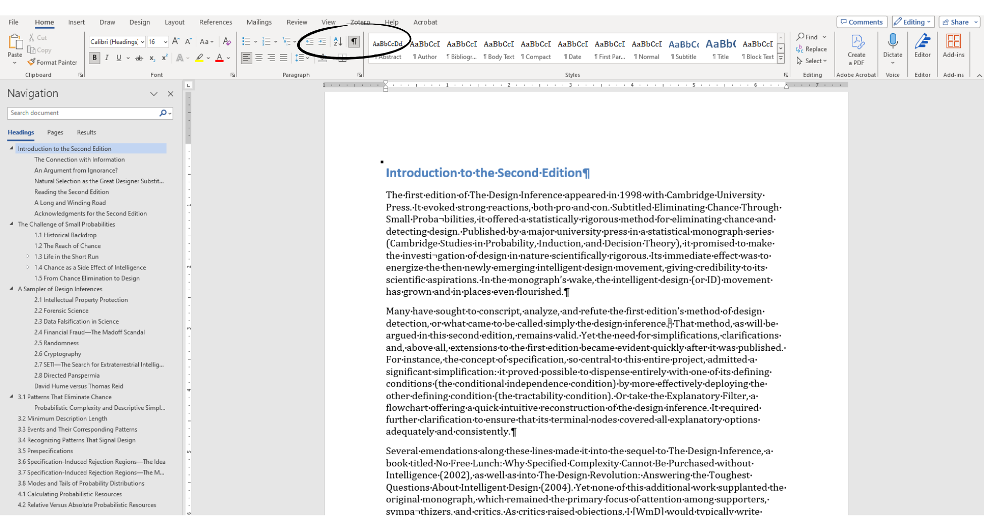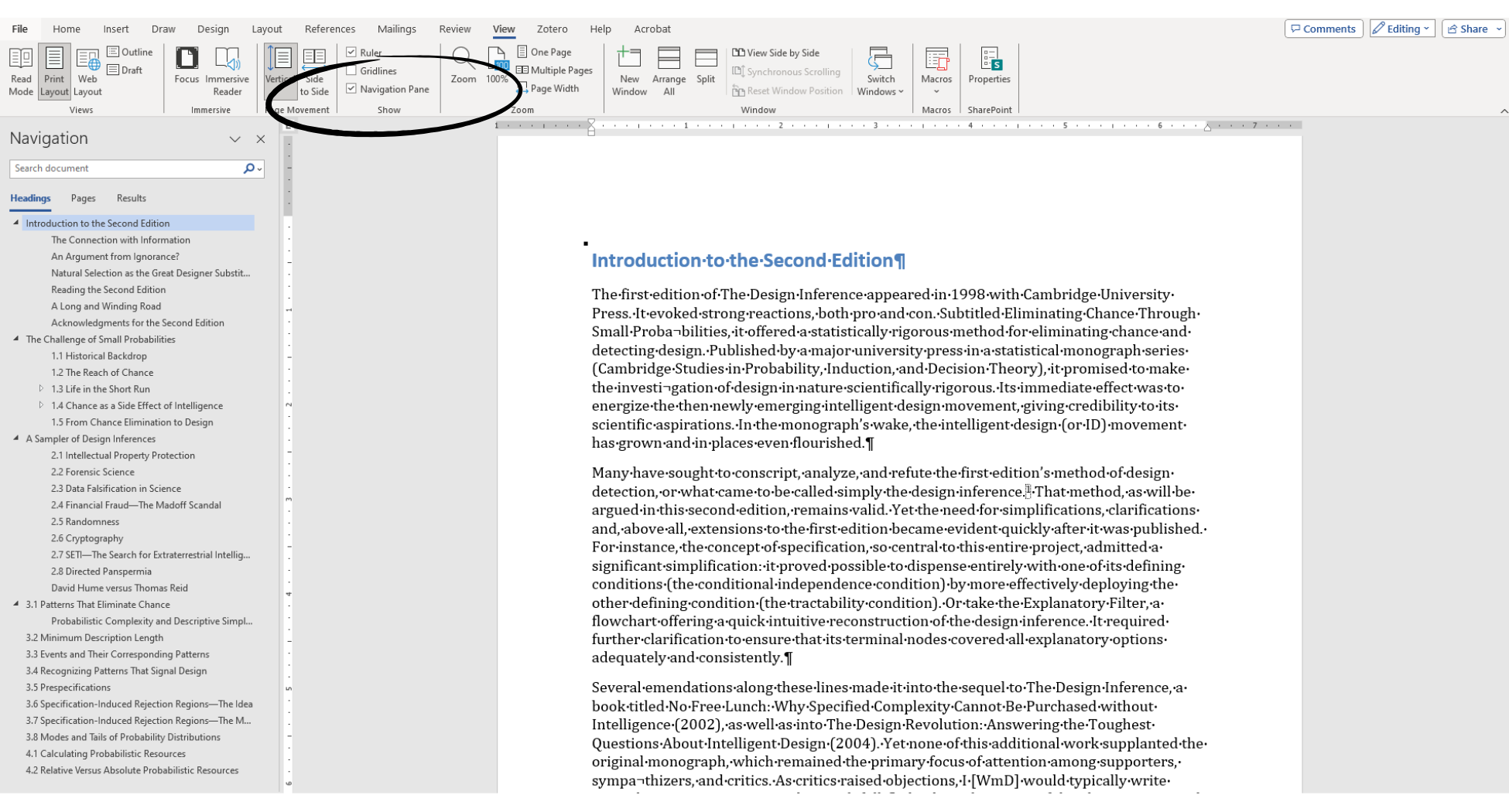 First, let’s turn on the Navigation Panel. To do that, click view in the top menu, then make sure the option for Navigation Pane is checked. This will display a navigation menu on the left side of the screen that shows all chapter and sectizon titles within your document. This allows you to easily jump around within your document.